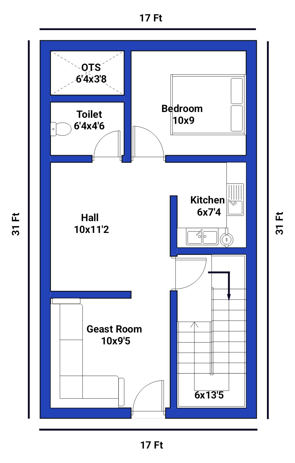 आजकल शहरों और कस्बों में प्लॉट का साइज छोटा होता जा रहा है। ऐसे में लोग चाहते हैं कि कम जगह में भी एक अच्छा और आरामदायक घर बन सके। अगर आपके पास लगभग 17×31 फीट का प्लॉट है तो यह हाउस प्लान आपके लिए एक बेहतरीन विकल्प हो सकता है।इस डिजाइन में 2 कमरे, एक हॉल, किचन, टॉयलेट, OTS और सीढ़ी को बहुत अच्छे तरीके से प्लान किया गया है ताकि घर छोटा होते हुए भी खुला और आरामदायक लगे।यह प्लान खास तौर पर उन लोगों के लिए बनाया गया है जो कम बजट में सुंदर और उपयोगी घर बनाना चाहते हैं।
